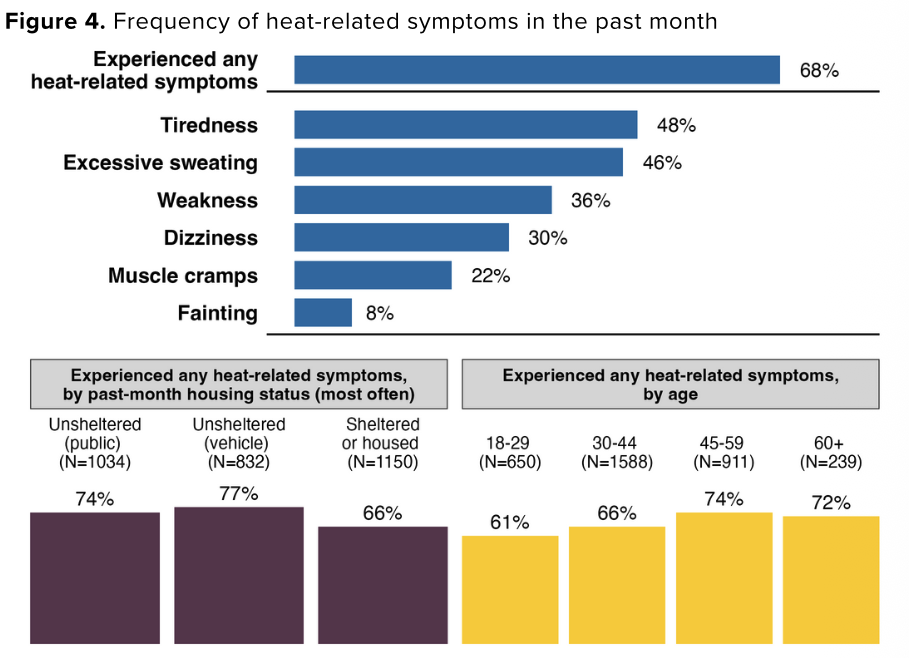 Heat exposure translated into substantial health impacts. Across all survey responses, just over two-thirds (68%) reported experiencing at least one heat-related symptom in the past month. Unsheltered respondents—both those living in public spaces and in vehicles—experienced a higher burden of heat-related symptoms than sheltered respondents. Approximately three-quarters of unsheltered responses reported at least one heat-related symptom, compared with about two-thirds of sheltered or housed responses. Older adults were disproportionately affected.