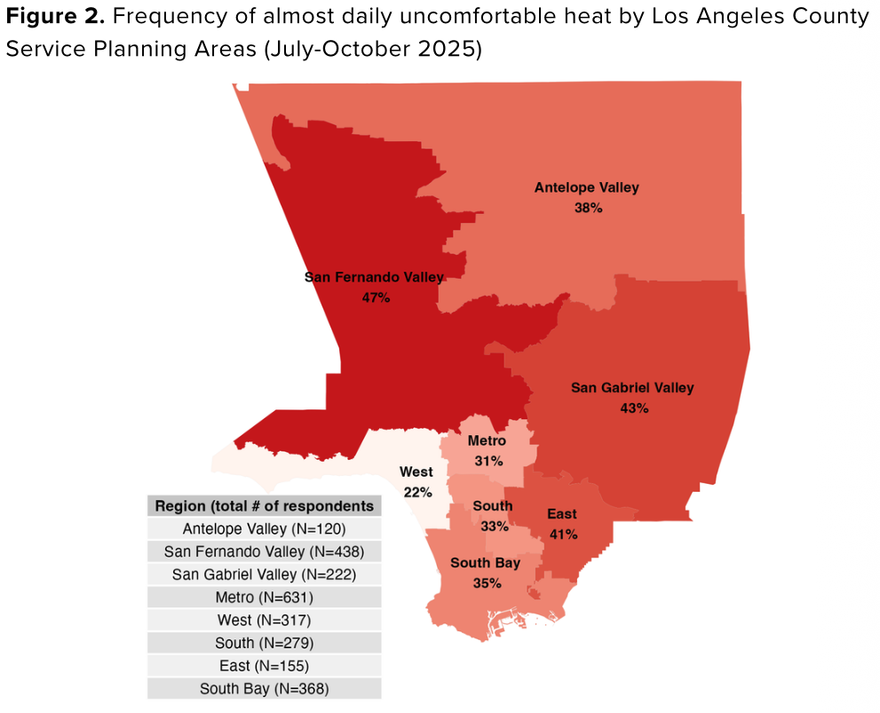 Heat exposure also showed clear geographic variation across the county’s Service Planning Areas (SPAs). Rates of experiencing uncomfortable heat almost daily between July and October were highest in the San Fernando Valley (47%) and San Gabriel Valley (43%), and lowest in Metro (downtown) LA (31%) and West LA (22%). These patterns closely mirrored regional temperature differences, with inland SPAs (i.e., Antelope Valley, San Fernando Valley, San Gabriel Valley) experiencing the highest maximum temperatures during the summer months.