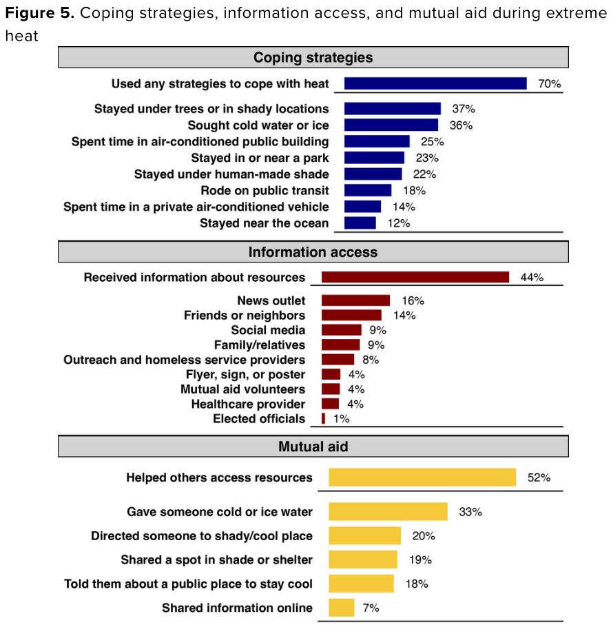Despite these health challenges, many respondents reported engaging in coping strategies to deal with extreme heat. Seventy percent of respondents reported using at least one strategy to cope with the heat in the past month, such as reporting staying under trees or in shady locations (37%), in air-conditioned public buildings (25%), or in or near a park (23%) as well as seeking cold water or ice (36%) and riding on public transit (18%).