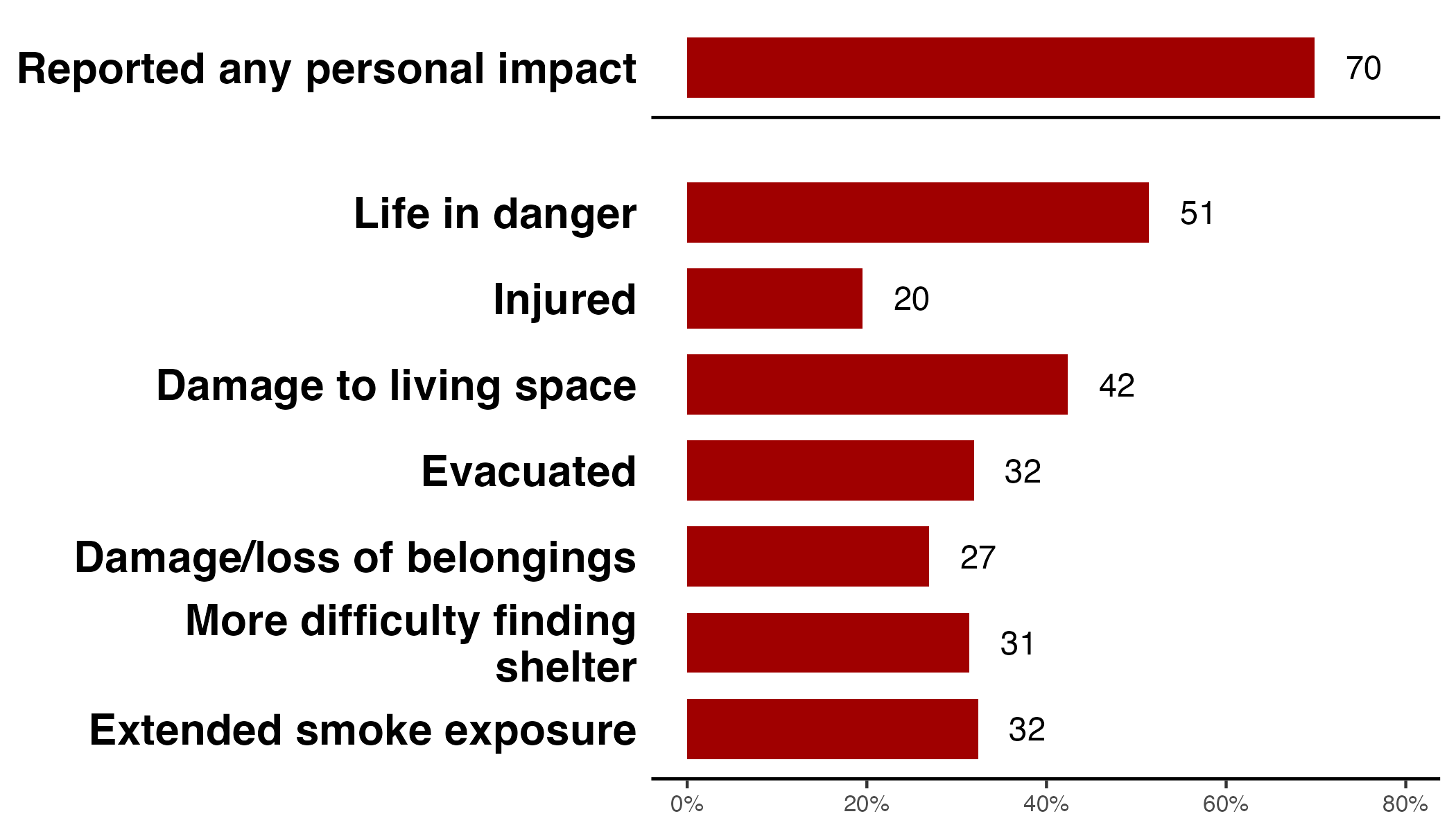 Seventy percent of respondents reported experiencing at least one form of harm or disruption. Just over half (51%) said they felt their lives were in danger, and nearly 42% reported damage to their living space. Around a third reported being forced to walk through smoke for extended periods (35%), to evacuate (32%), or to navigate greater difficulty finding shelter (31%). One in five (20%) reported being injured.